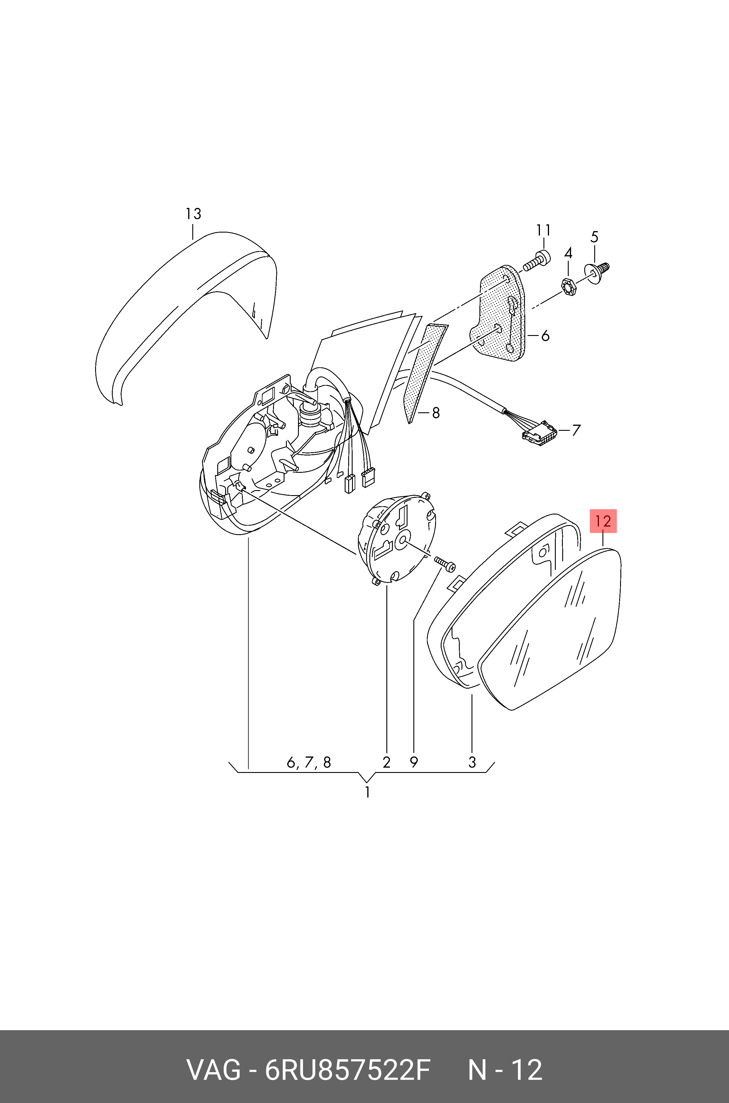 6RU 857 522 F VAG VAG Polo седан зеркальный элемент правого зеркала с подогревом